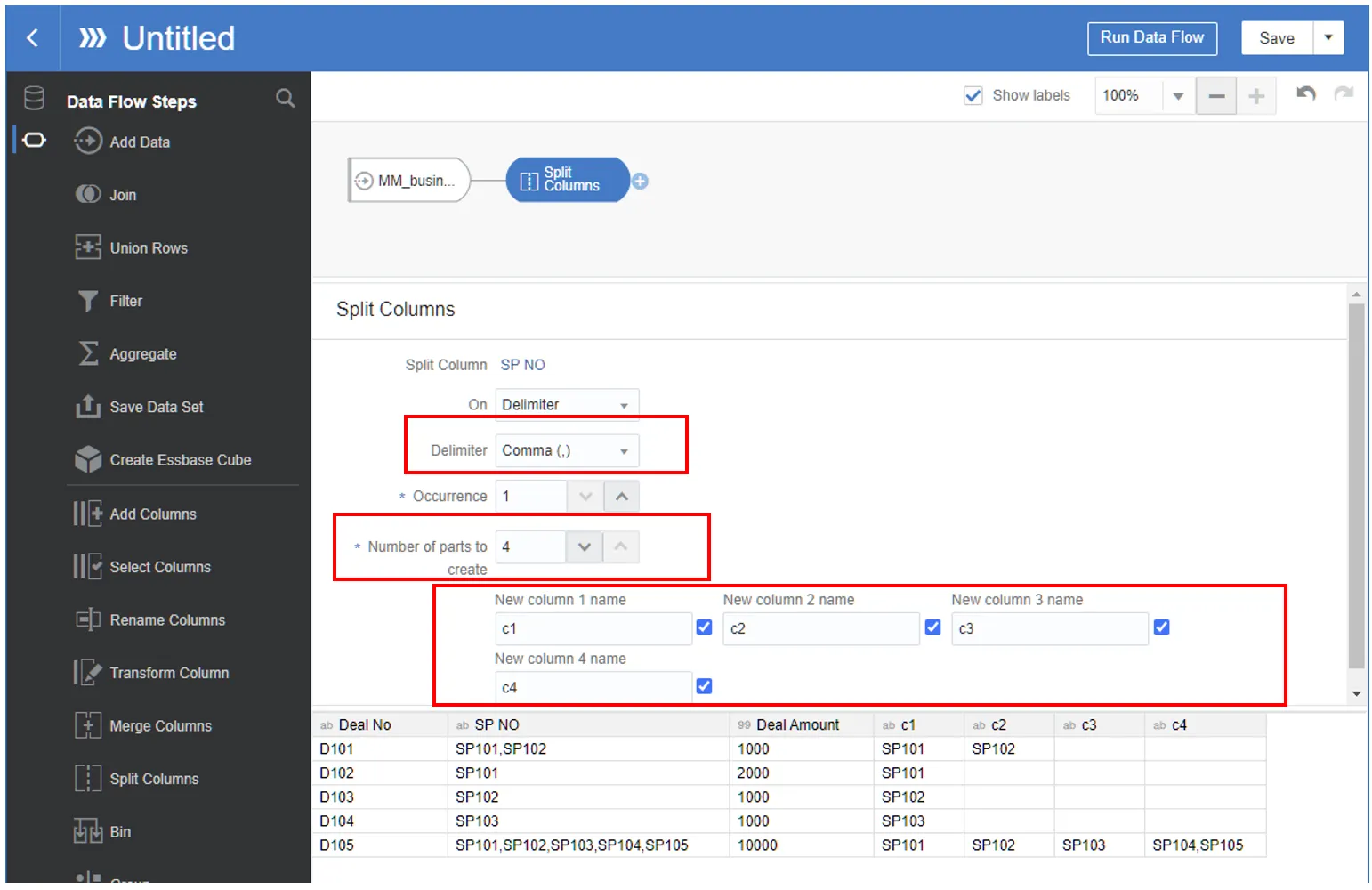 Set the delimiter as a comma and specify the number of parts to create as 4 and define new column names for easier handling at later steps.