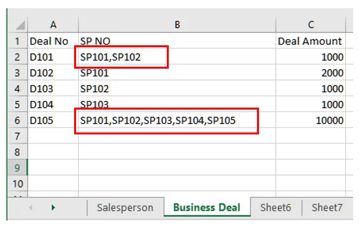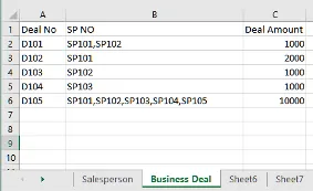 Each salesperson (SP No/SP Name) can have multiple deals (Deal No).