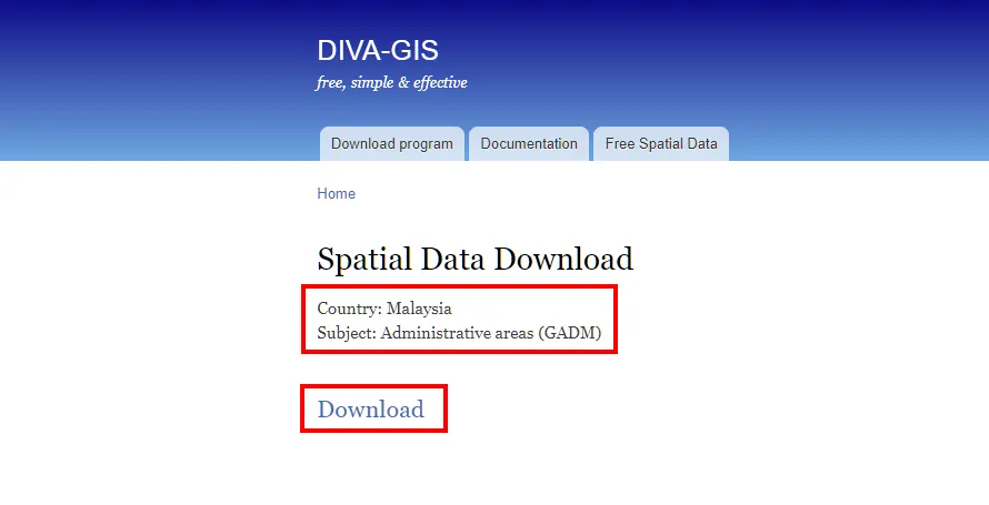DIVA-GIS portal interface for downloading Malaysian administrative boundary data
