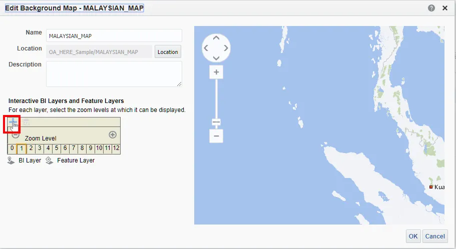 The Edit Background Map dialog for MALAYSIAN_MAP, showing the initial configuration state. The interface includes the map's basic properties, a preview panel, and the Interactive BI Layers section where we can add and configure map layers. The plus icon for adding new layers is highlighted.