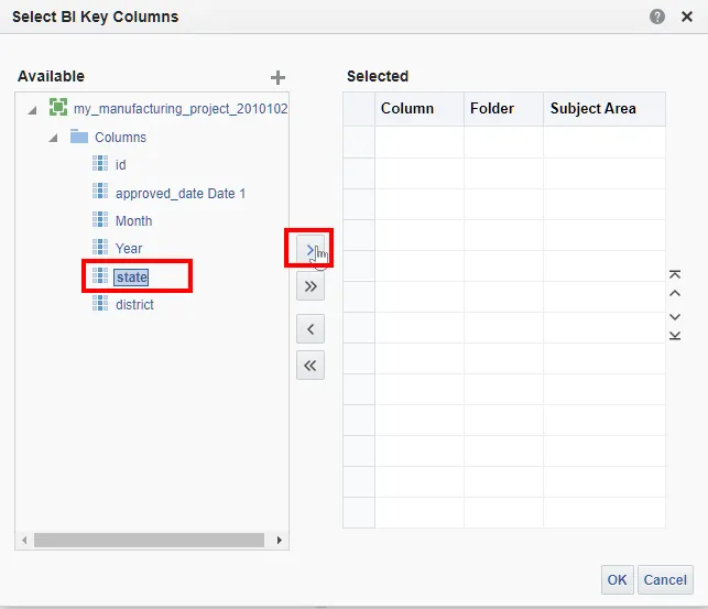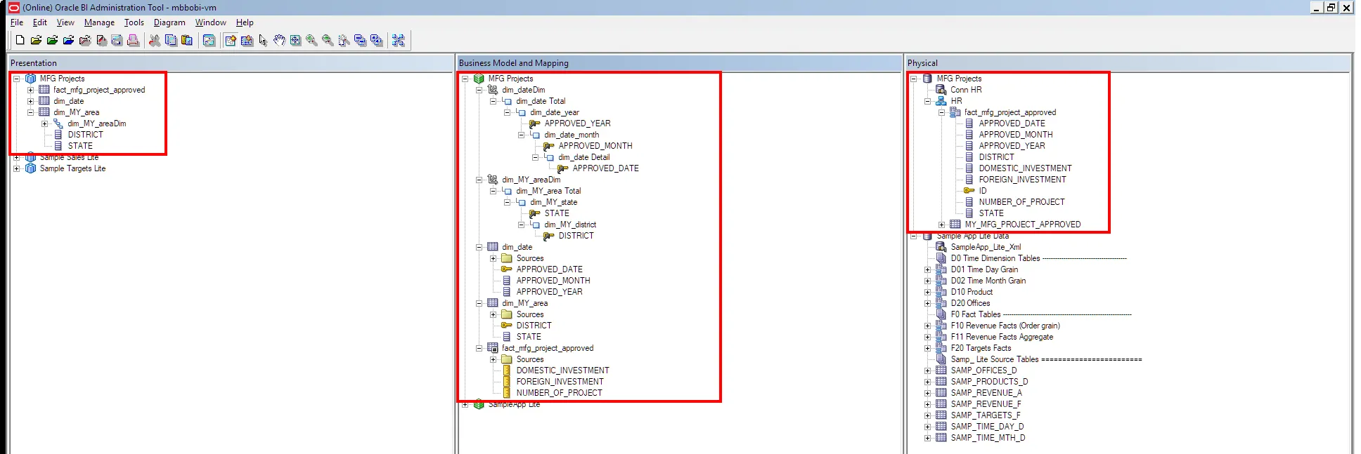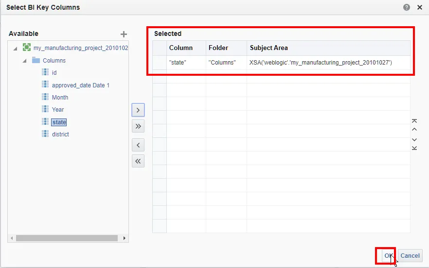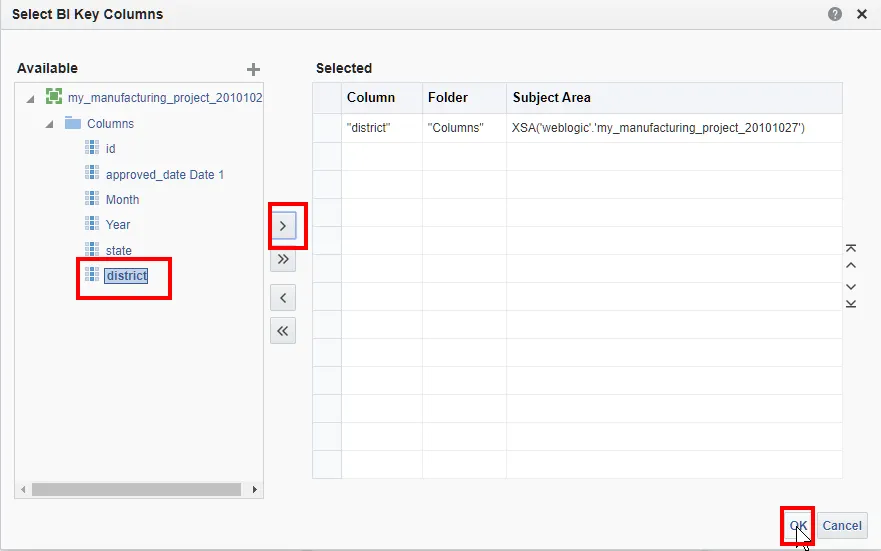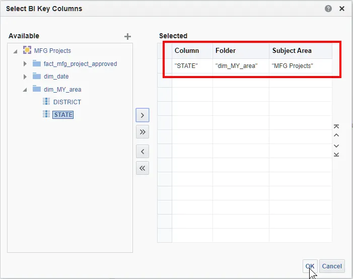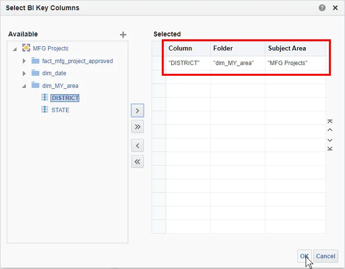 Verify the mapping shows: Column="DISTRICT", Folder="dim_MY_area", Subject Area="MFG Projects"