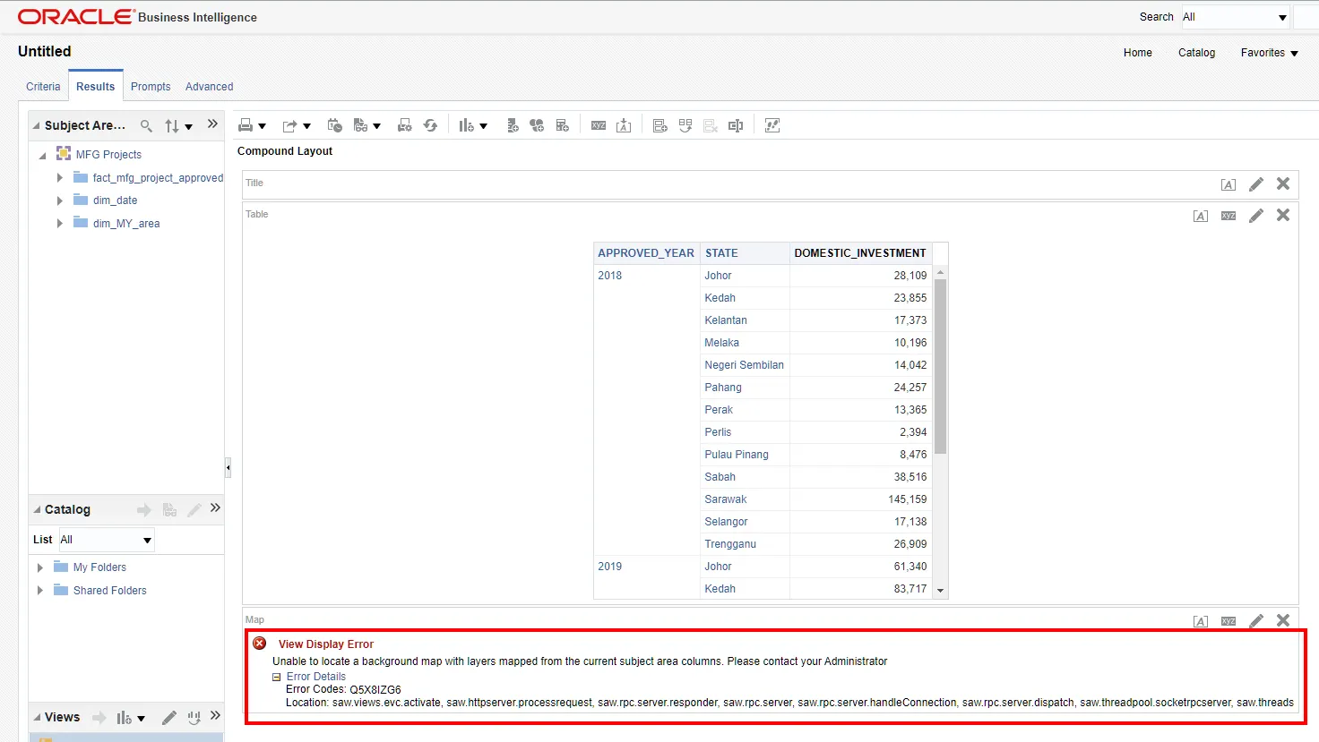 This error indicates that while we have geographic data in our RPD, it hasn't been properly connected to the map tile layers in OBIEE.