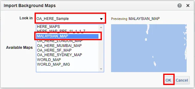The Import Background Maps dialog window displaying the selection process for a new background map. The "OA_HERE_Sample" data source is selected in the dropdown, and "MALAYSIAN_MAP" is highlighted in the Available Maps list. A preview pane on the right shows the selected map's coverage area.