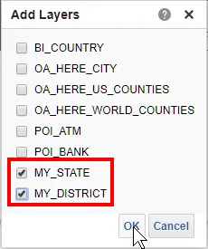 The Add Layers selection dialog showing both MY_STATE and MY_DISTRICT layers selected for addition to our background map. This compact dialog allows for efficient multiple layer selection in one operation.