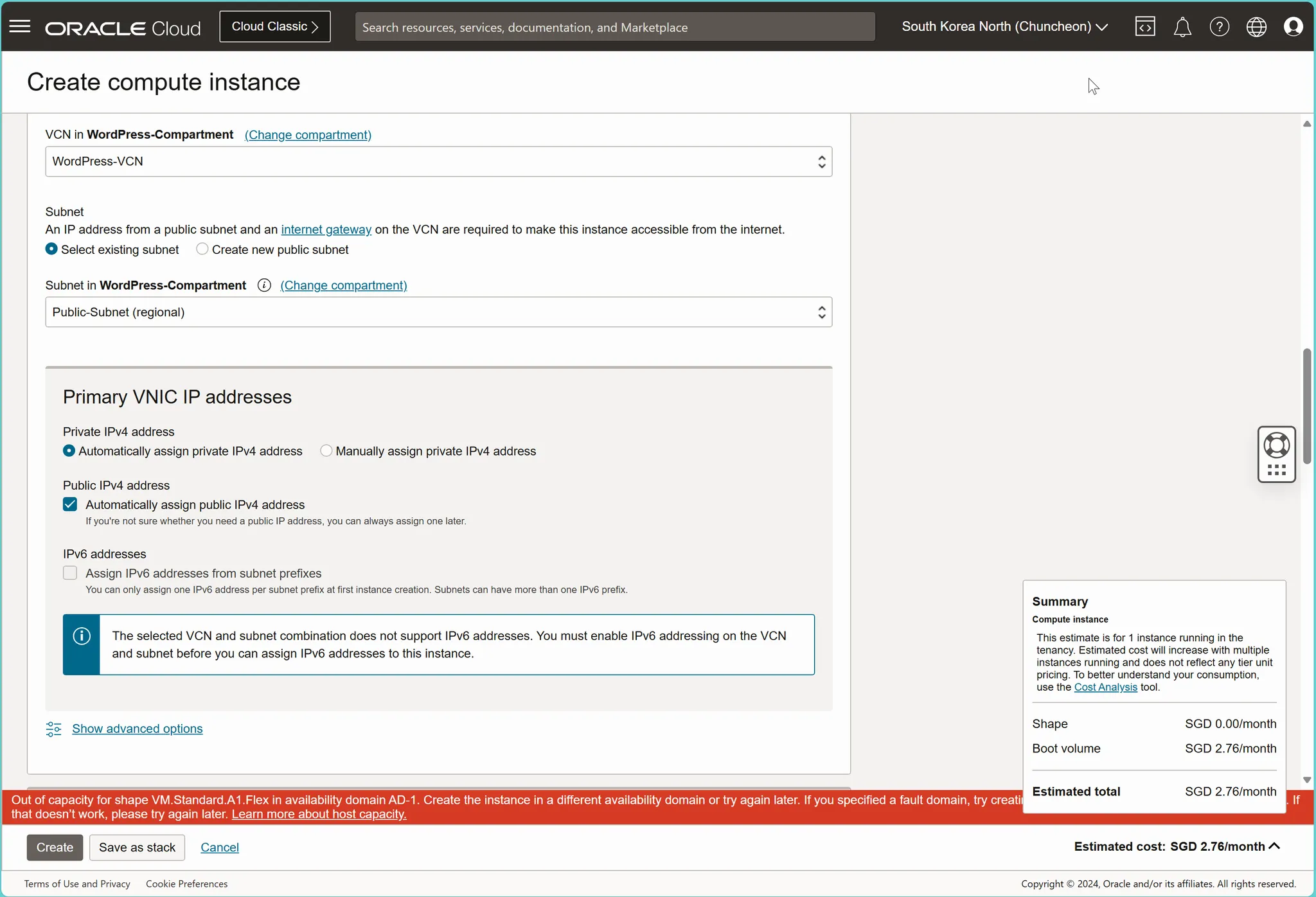 "OCI Free Tier 자원을 사용해 WordPress 구축하기" 프로젝트는 인스턴스 생성에 성공하면 재개하도록 하겠습니다. 끈기를 가지고 계속 시도해 보겠습니다!