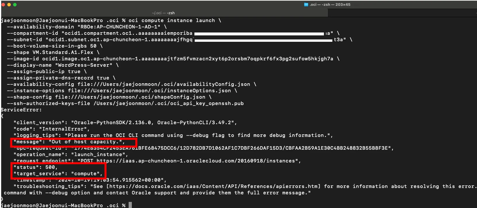 OCI CLI 명령어를 직접 실행하여 정상 작동하는지 확인합니다. "Out of host capacity" 등의 메시지가 포함되면 명령어 실행은 성공적입니다.