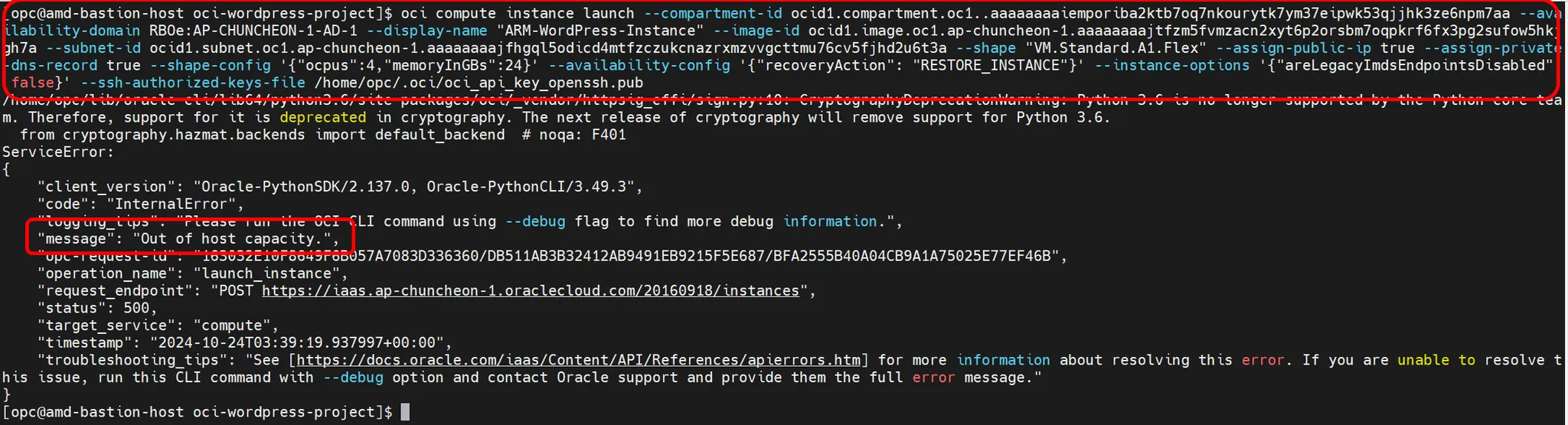 "OCI Free Tier 자원을 사용해 WordPress 구축하기" 프로젝트는 인스턴스 생성에 성공하면 재개하도록 하겠습니다. 끈기를 가지고 계속 시도해 보겠습니다!