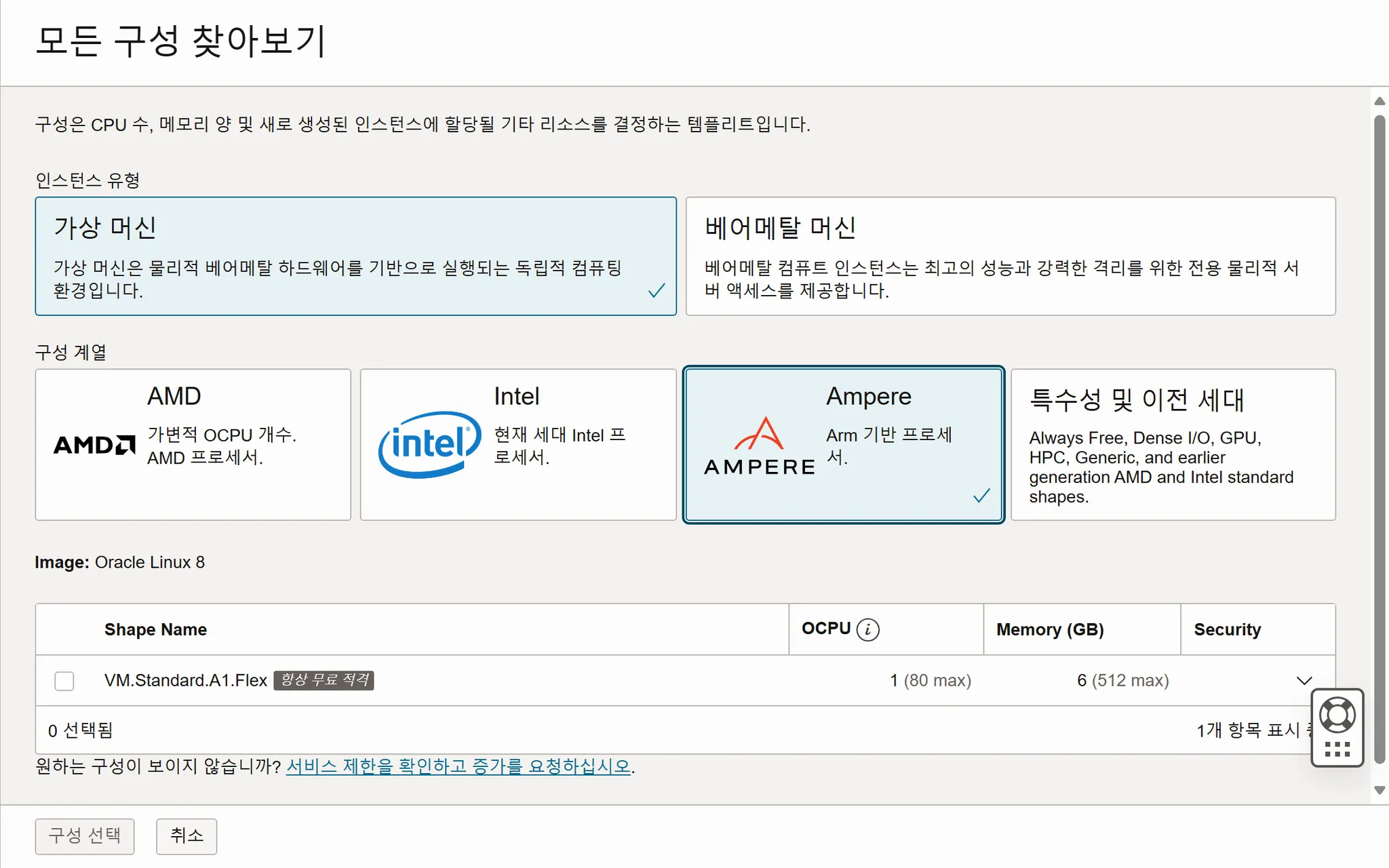 여러분! 기쁜 소식이 있어요. 제가 드디어 ARM기반의 Ampere A1인스턴스를 만들었어요. 아래 그림을 한번 보실래요?