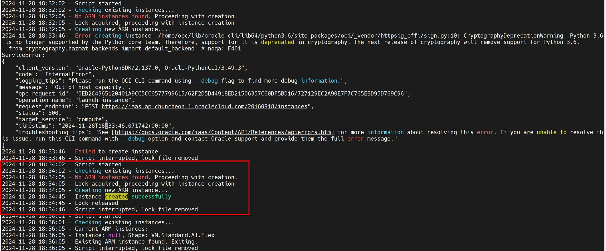 리눅스의 cron job으로 등록해서 2분 간격으로 실행되도록 설정해 놓은 다음 잊고 살았었는데, 실행 로그를 몇일 만에 확인해 보니 만들어져 있었네요! 처음 시도한 지 한달이상 걸렸네요. 제 계정은 그동안 Free Trial 상태였습니다만, 무료 체험 기간이 지나고 2024-11-28에 유료 계정으로 업그레이드를 했답니다. 그동안 무료 계정이었을 때는 만들어 지지 않다가 유료 계정으로 전환하는 시점에 ARM기반 무료 인스턴스가 만들어 졌네요. 우연인지는 모르겠으나, 참고 할 가치는 있는 것 같아요! 무료계정보다는 유료로 전환한 계정에 무료 ARM 기반 인스턴스 우선권을 주는 정책이 있었을 지도요!