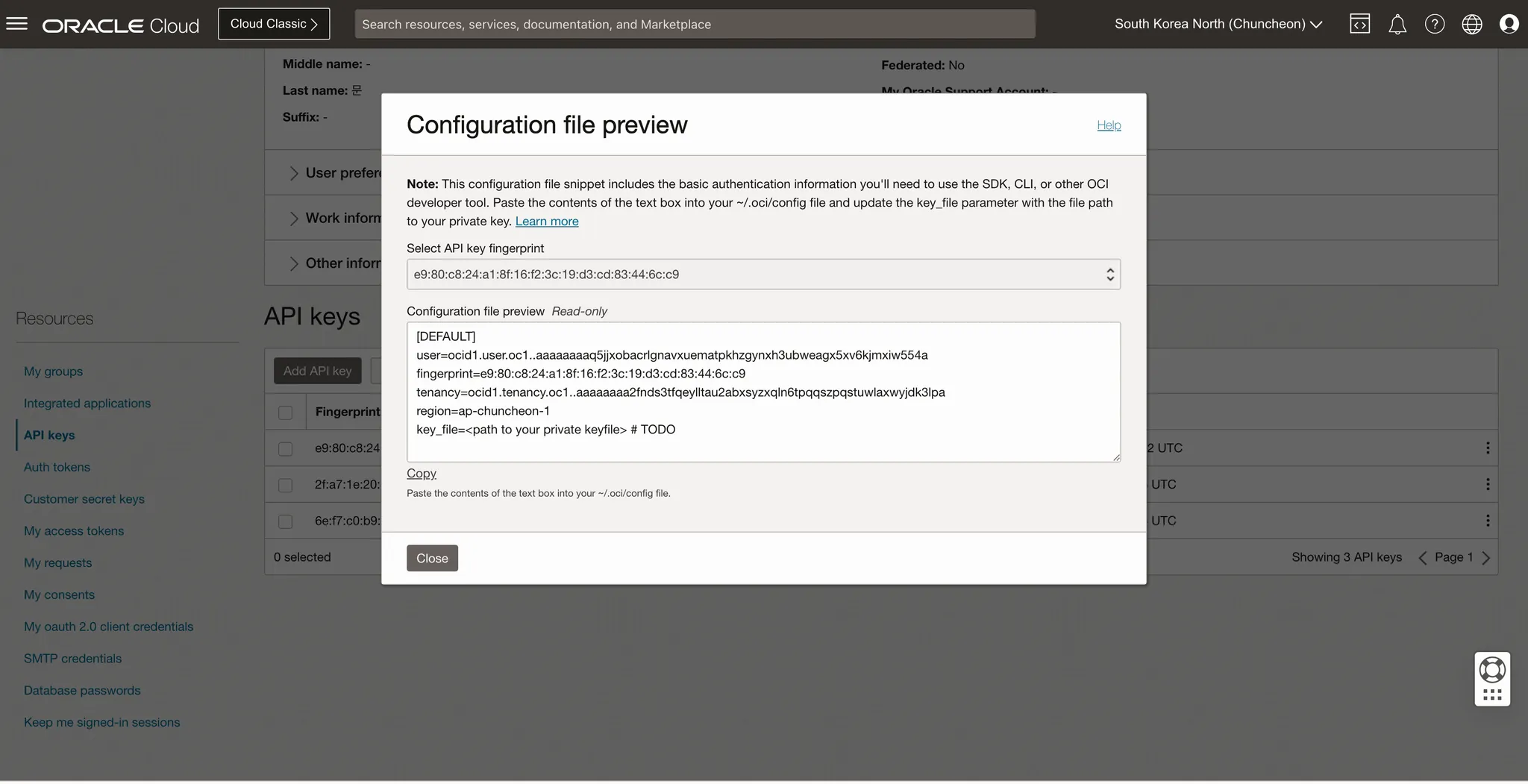 그래서 별도로 키를 생성할 필요 없이, 생성된 public key를 OCI Console의 사용자 설정에 등록하면 됩니다.