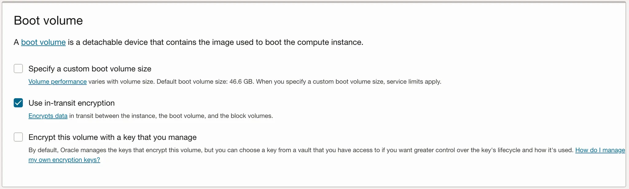 Boot volume 섹션에서 “Use in-transit encryption”을 선택합니다.