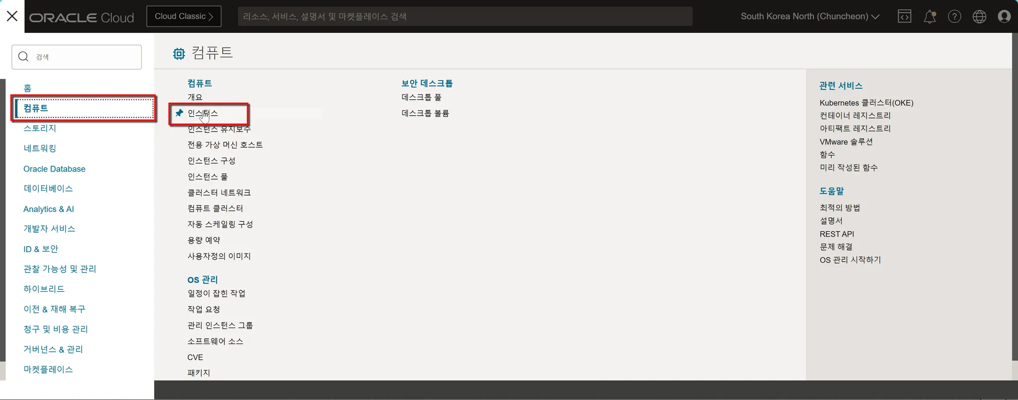 왼쪽 메뉴에서 '컴퓨트' > '인스턴스'로 이동합니다.