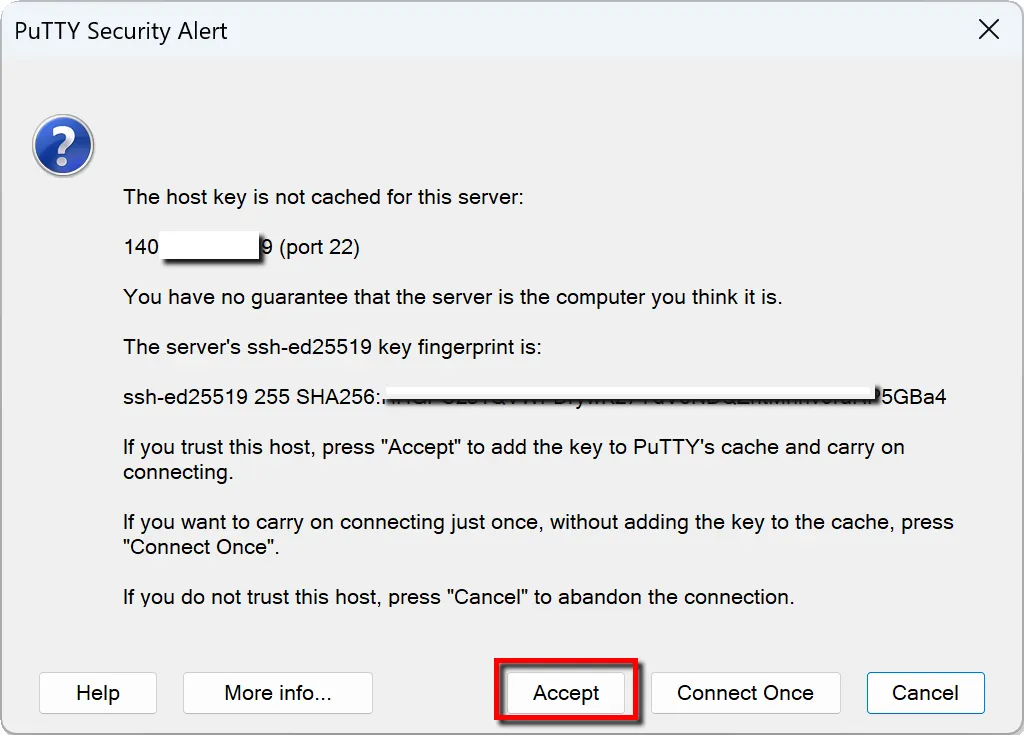 "fingerprint" 관련 경고가 뜨면 'Accept'를 선택하면 됩니다.