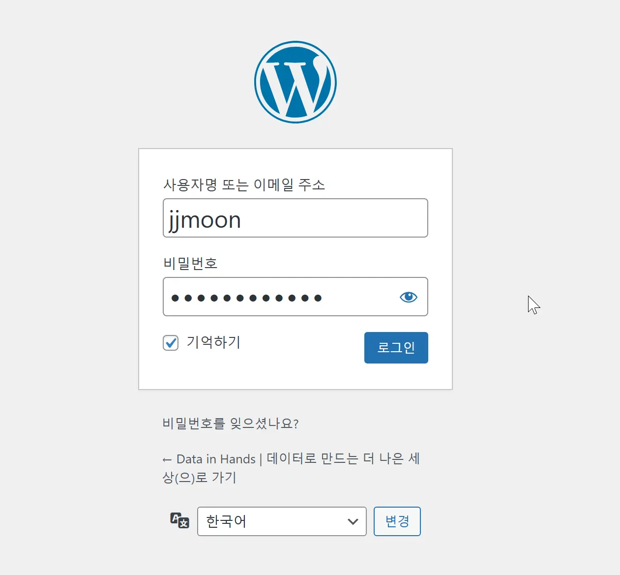 저는 이전에 wordpress_db라는 데이터베이스를 하나 만들어 두었고요. admin이라는 기본 관리자로 설정 작업을 진행하고 있었답니다! 여러분에게 해당하는 정보로 적용해 주세요.
