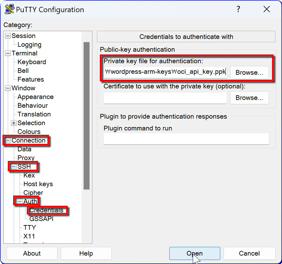 SSH > Auth 메뉴에서 개인키 파일(.ppk) 선택