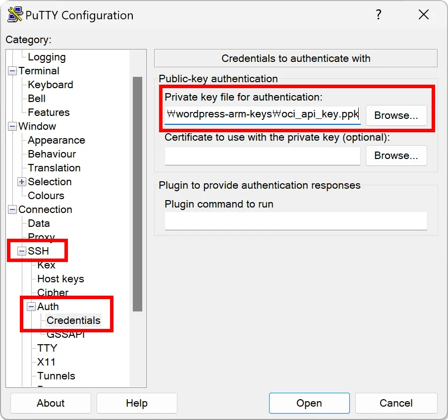 Private key file for authentication에서 WordPress 서버 접속용 프라이빗 키 선택