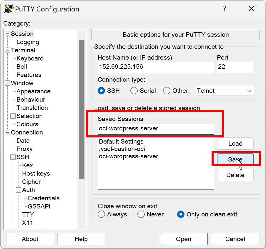 Saved Sessions에 적절한 이름 입력 (예: WordPress-MySQL-Tunnel)
