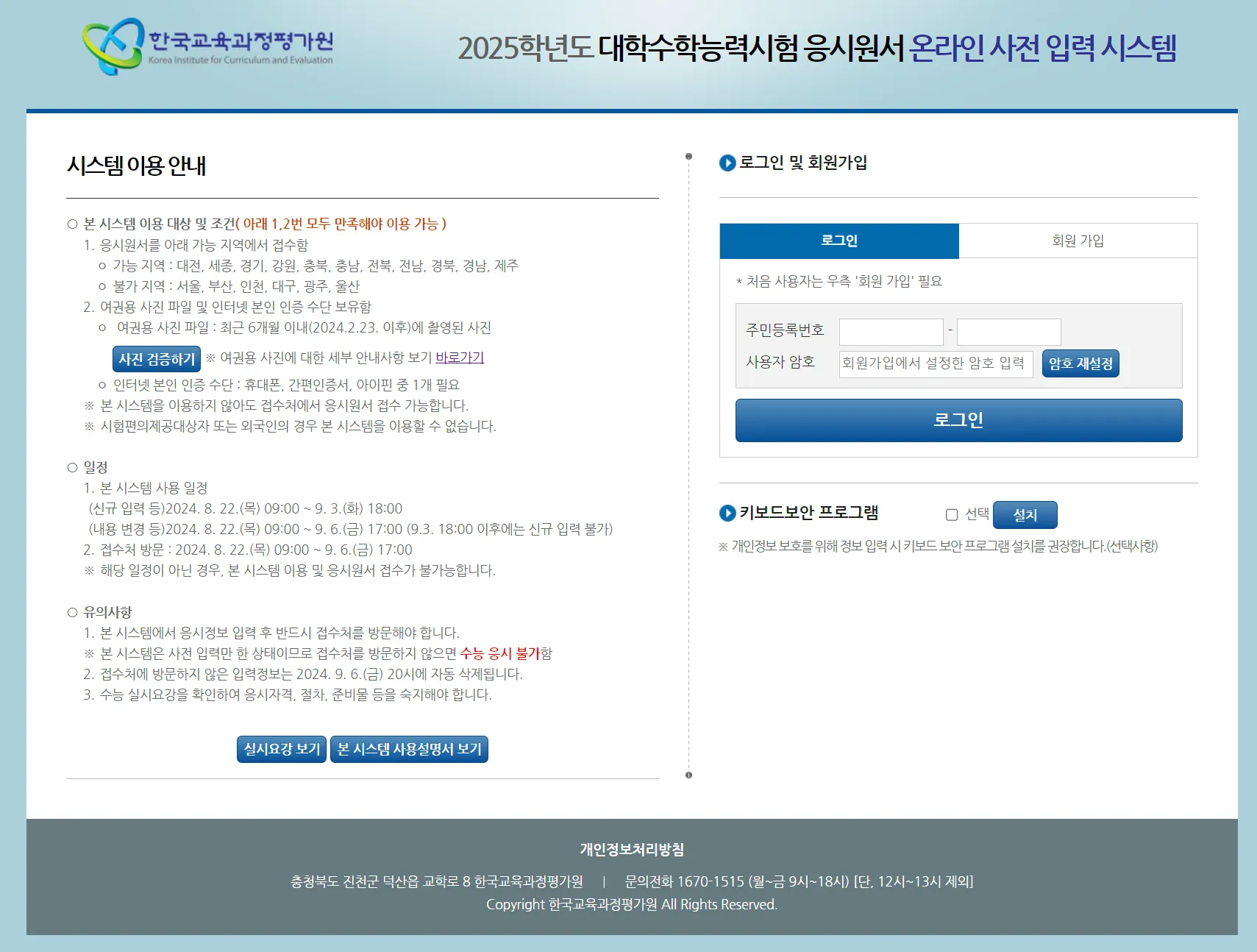 2025학년도 대학수학능력시험 응시원서 온라인 사전 입력시스템 사이트